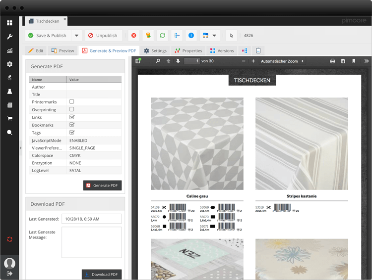 Das erste Projekt, das wir umgesetzt haben, war ein Gartenkatalog von über 200 Seiten mit der Web-to-Print-Lösung von Pimcore, gefolgt von einem ähnlich umfangreichen Tischtuchkatalog für die Marke Vénilia. Da ein großer Teil der Katalogseiten, einschließlich Druckmarken, Stanzungen usw., nun automatisch produziert werden kann, haben sich der Aufwand und die Kosten für die Katalogproduktion erheblich reduziert. Die Qualität des fertigen Werbematerials steht einem manuell gestalteten Katalog in nichts nach. Auch Änderungen lassen sich schnell und ohne zusätzliches Layoutprogramm umsetzen: Produktdaten können jederzeit bequem über das Pimcore-Backend aktualisiert und in die jeweilige Katalogdatei übertragen werden.