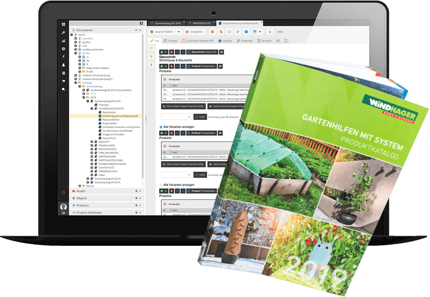 Um die Katalogproduktion von Windhager zu automatisieren, haben wir eine intelligente Web-to-Print-Lösung eingesetzt: Das benutzerfreundliche Open-Source-Framework Pimcore wird zur Verwaltung der strukturierten Produktinformationen und Bilder für Print- und Download-Kataloge verwendet. Damit diese Daten im handumdrehen in das gewünschte Kataloglayout importiert werden können, haben wir den Pimcore-Controller entsprechend konfiguriert, eine HTML-Vorlage erstellt und das Mapping der Produktdaten mit dem Katalogdesign eingerichtet.